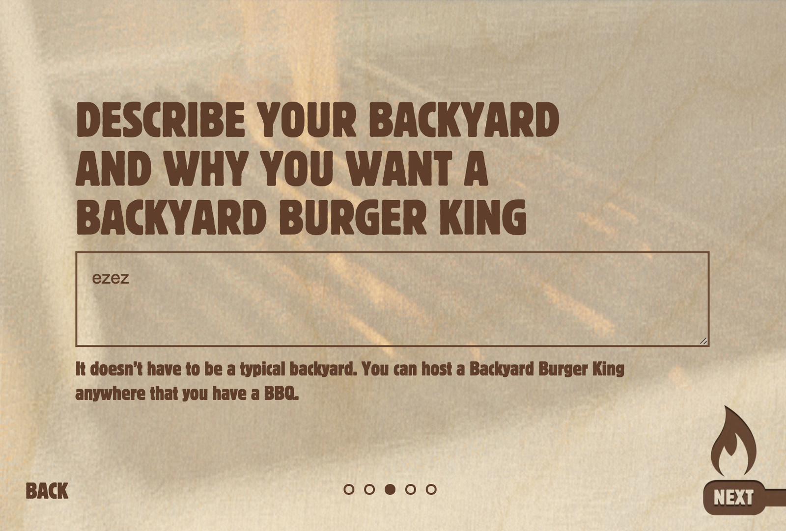 Premièrement, pour être sélectionné, il faut remplir un formulaire directement sur la page Facebook de Burger King NZ dans l’onglet « Backyard Burger Kings » (situé juste après celui des photos), indiquer ses coordonnées (prénom et adresse) et deuxièmement expliquer son projet. L’explication de ce dernier a une légère particularité, il doit être écrit en 140 caractères (petite référence à Twitter, réseau sur lequel ils sont très présents !). Un beau challenge pour pouvoir déguster son petit barbecue façon Burger King.