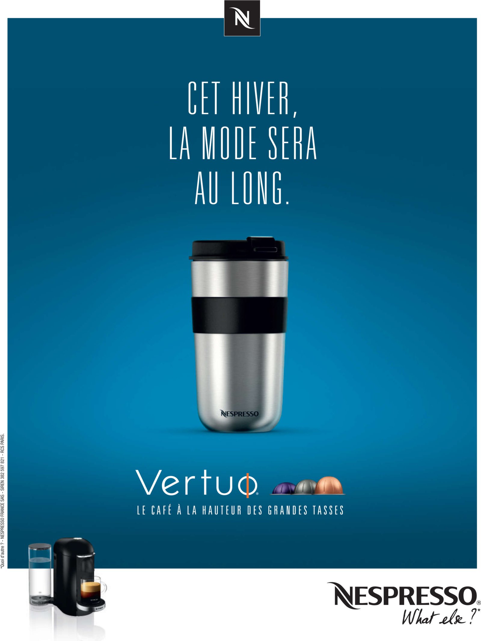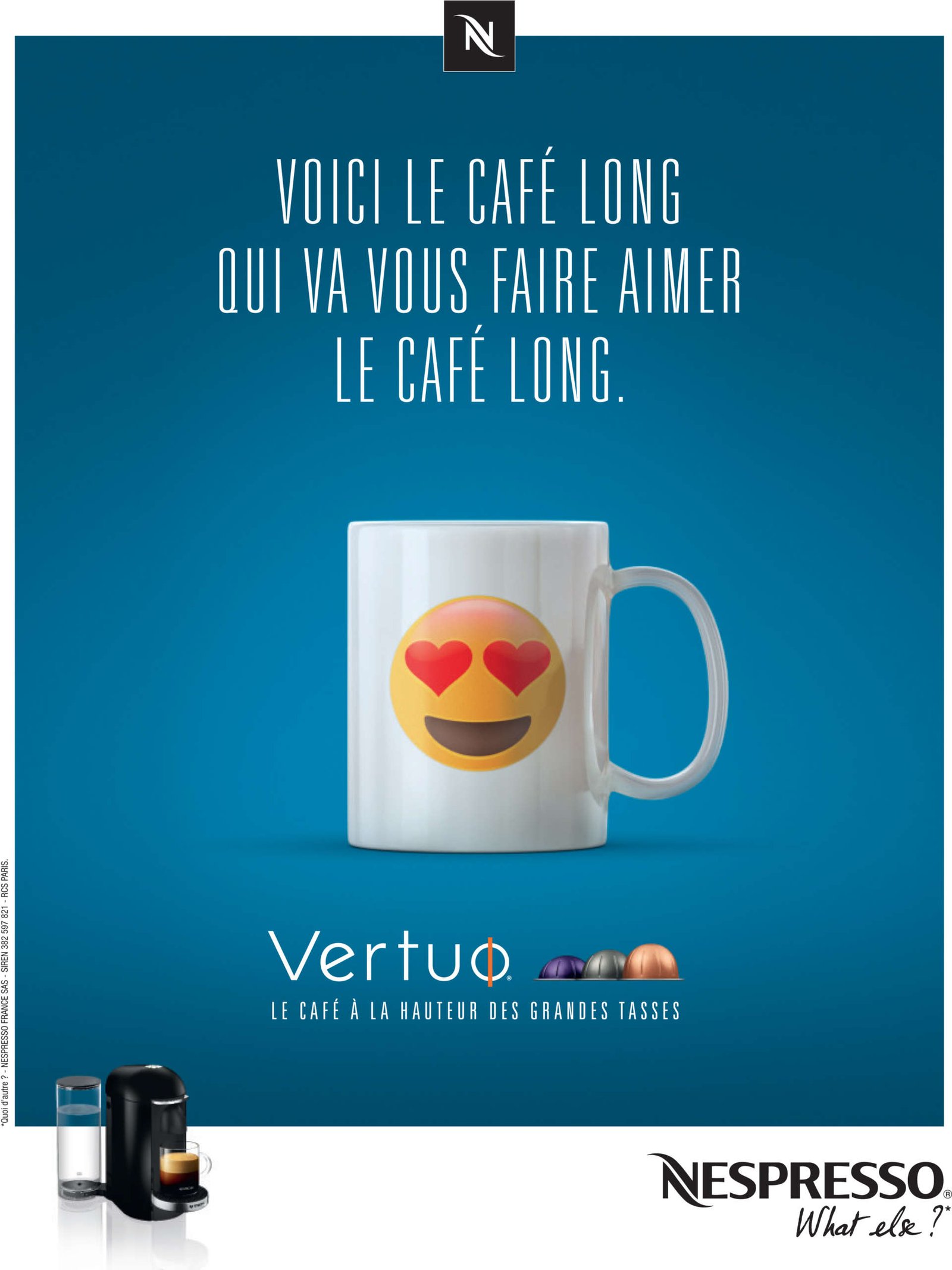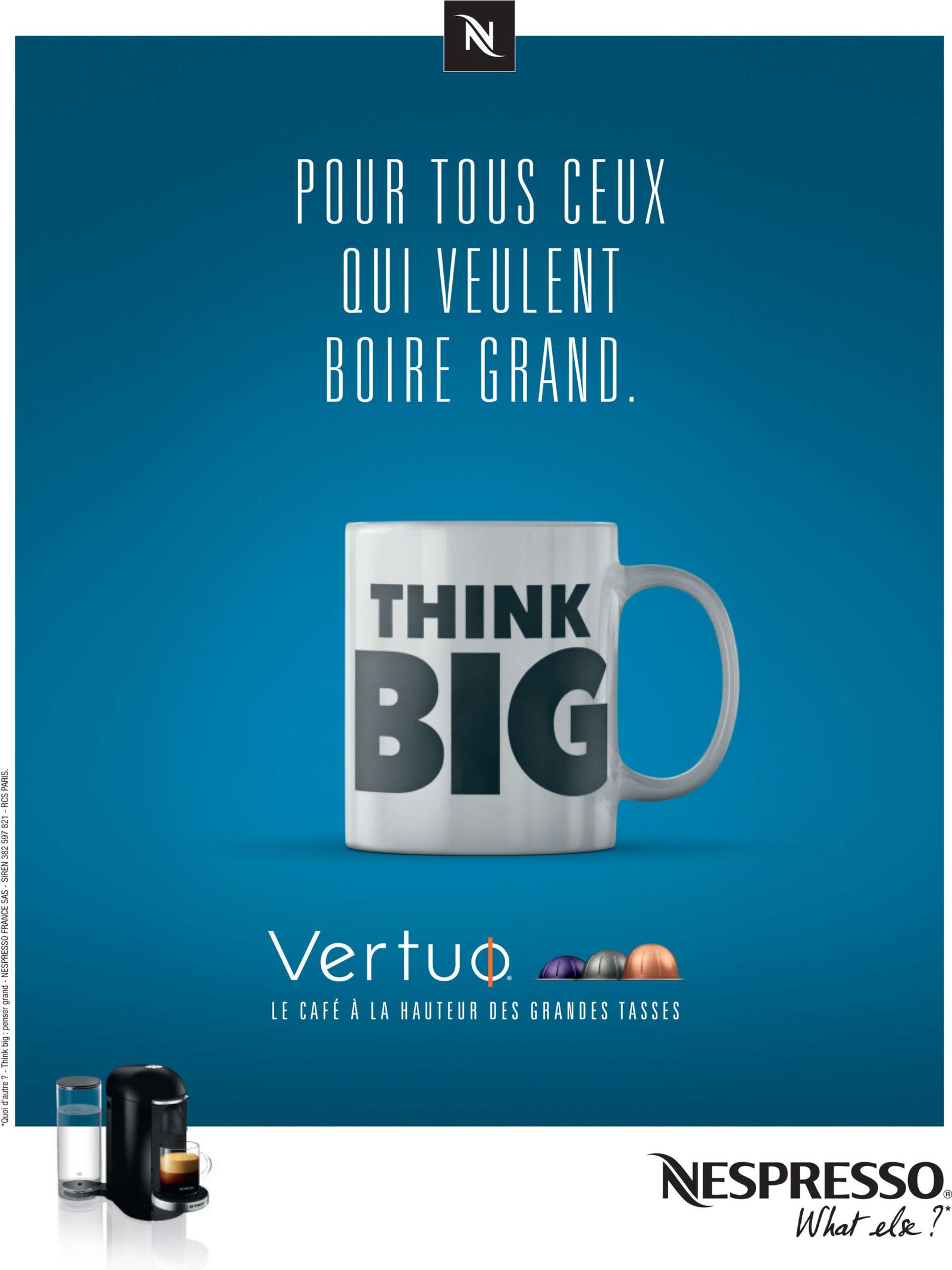 Le 30 novembre dernier, Nespresso a dévoilé la première campagne de communication digitale et print visant à soutenir la commercialisation de Vertuo®. Cette machine dotée d’une technologie d’extraction révolutionnaire permet d’offrir la qualité de café, chère à Nespresso, en grande tasse. Et pour promouvoir cette innovation auprès d’un large public, peu familier de la marque, Nespresso s’est affranchie de ses codes graphiques habituels et a imaginé un film de 45 secondes et 6 affiches résolument décalés.