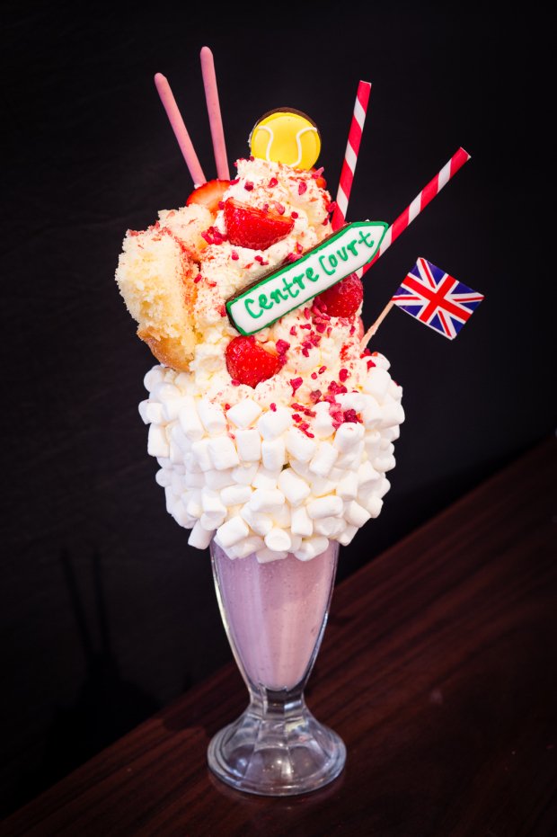 Souvenez-vous, il y a quelques temps, on vous parlait des freakshakes, ces milkshakes venus d’ailleurs. Le Wimbledon Shake, c’est un freakshake, aux couleurs de Wimbledon ! Côté ingrédients, on retrouve de la glace à la fraise, des fruits frais, un glaçage vanille, de la crème fouettée, des mini marshmallows ainsi qu’un gâteau et des sticks à la fraise. Une boisson gourmande et de saison !